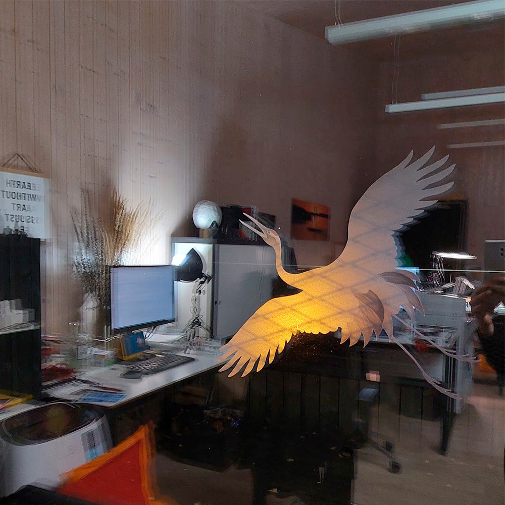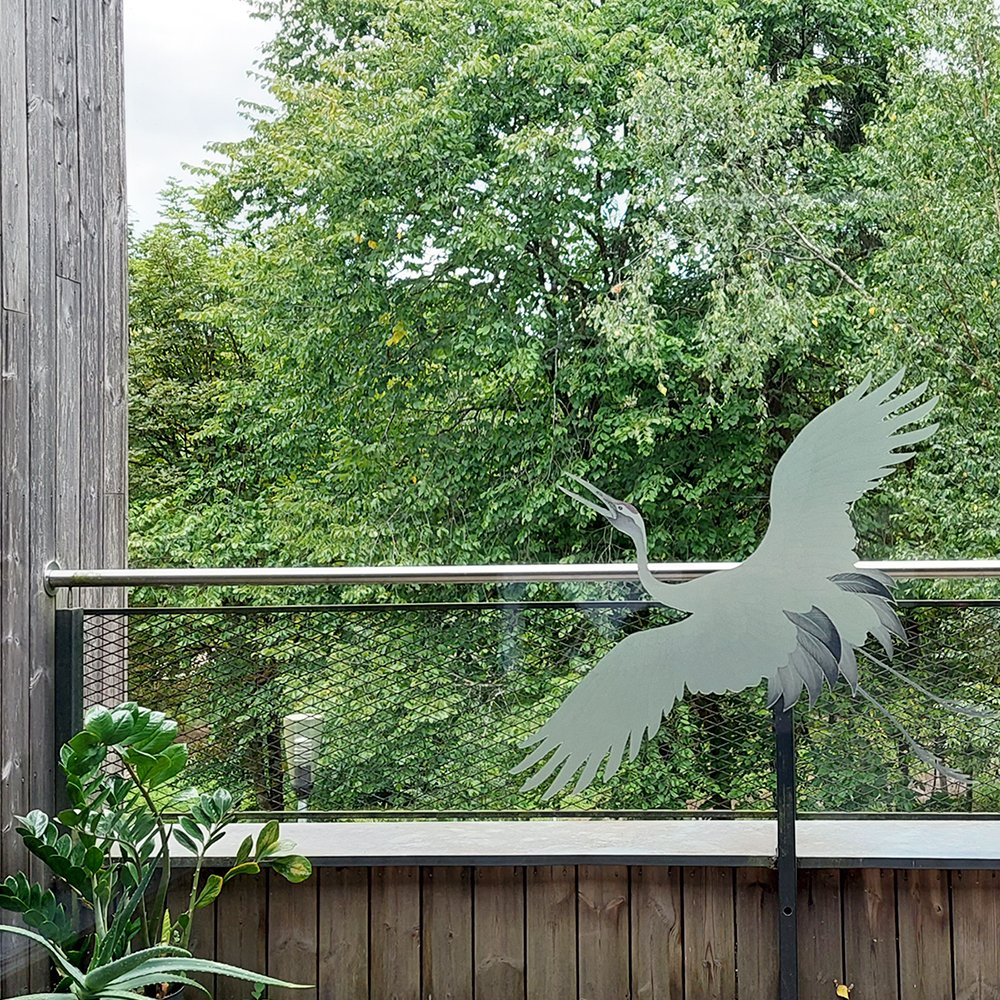 Dekoratyvus, spausdintas gervės lipdukas langams, stiklams, pertvaroms.