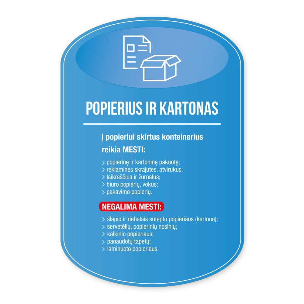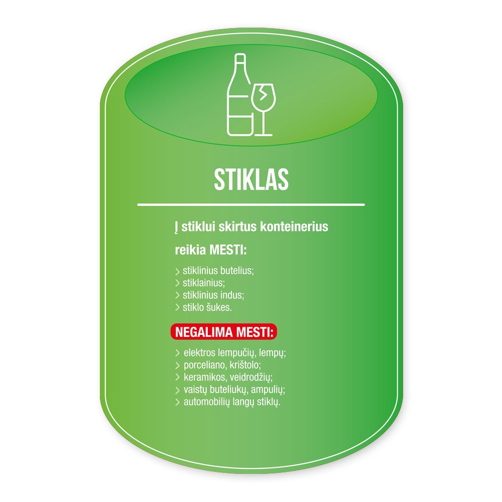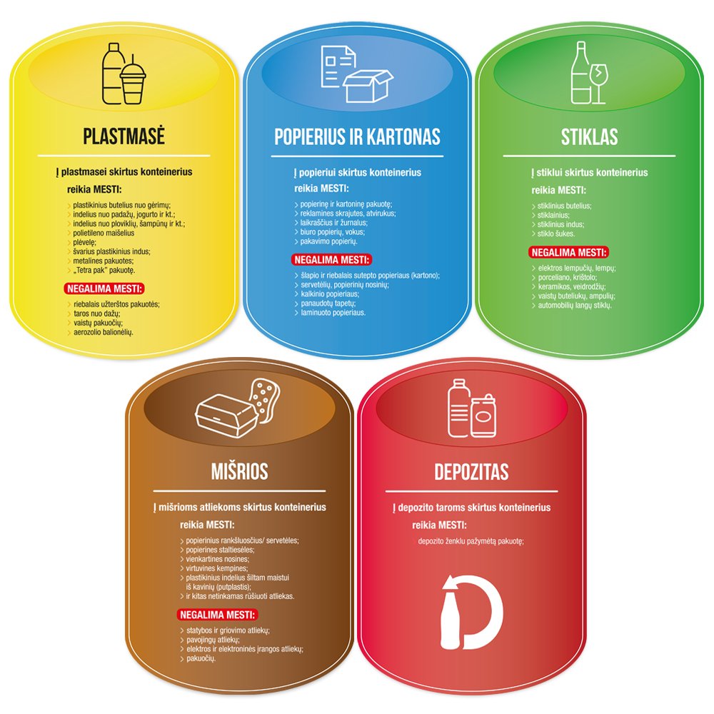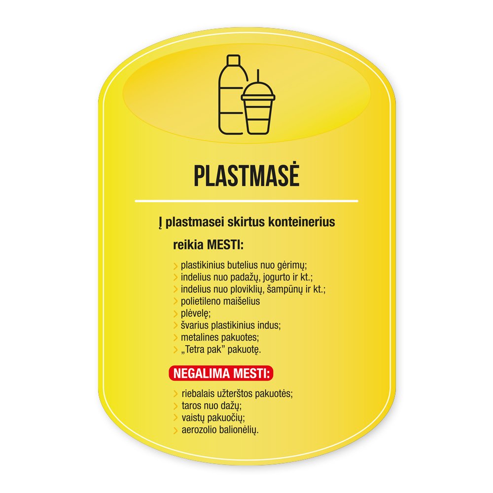 Klijuojami plastikiniai laminuoti rūšiavimo lipdukai konteineriams.